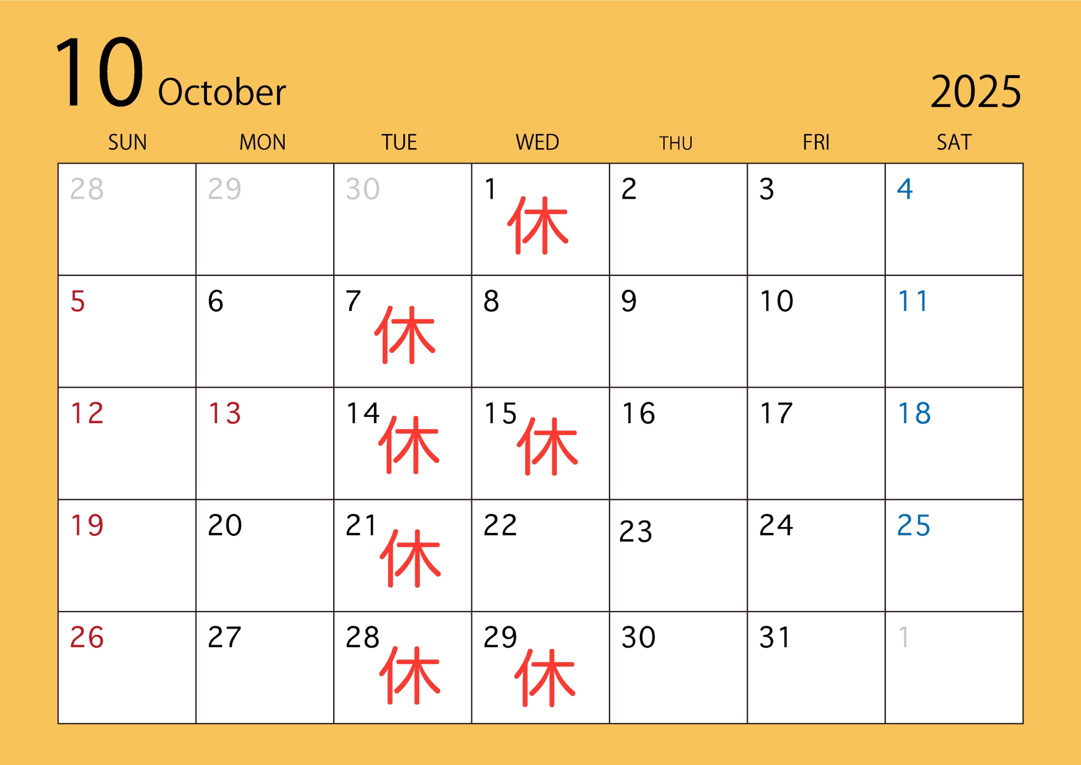 9 272025 10月の店休日 10月の店休日のお知らせ 1日(水) 7日(火) 14日(火) 15日(水) 21日(火) 28日(火) 29日(水) 10月は以上のとおりお休みさせていただきます。 どうぞよろしくお願いいたします。 Tweet Share Hatena Pocket RSS feedly Pin it この記事のタイトルとURLをコピーする 9月の店休日 前の記事
